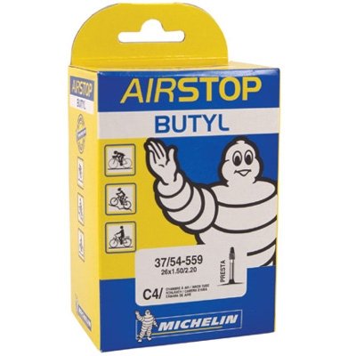 Michelin C4 butyl mountain bike tube. Standard weight, 34mm Schrader or threaded Presta valve stem, 36mm, 40mm or 60mm. Size 26x1.6" to 26x2.2" tires. 194 grams.
